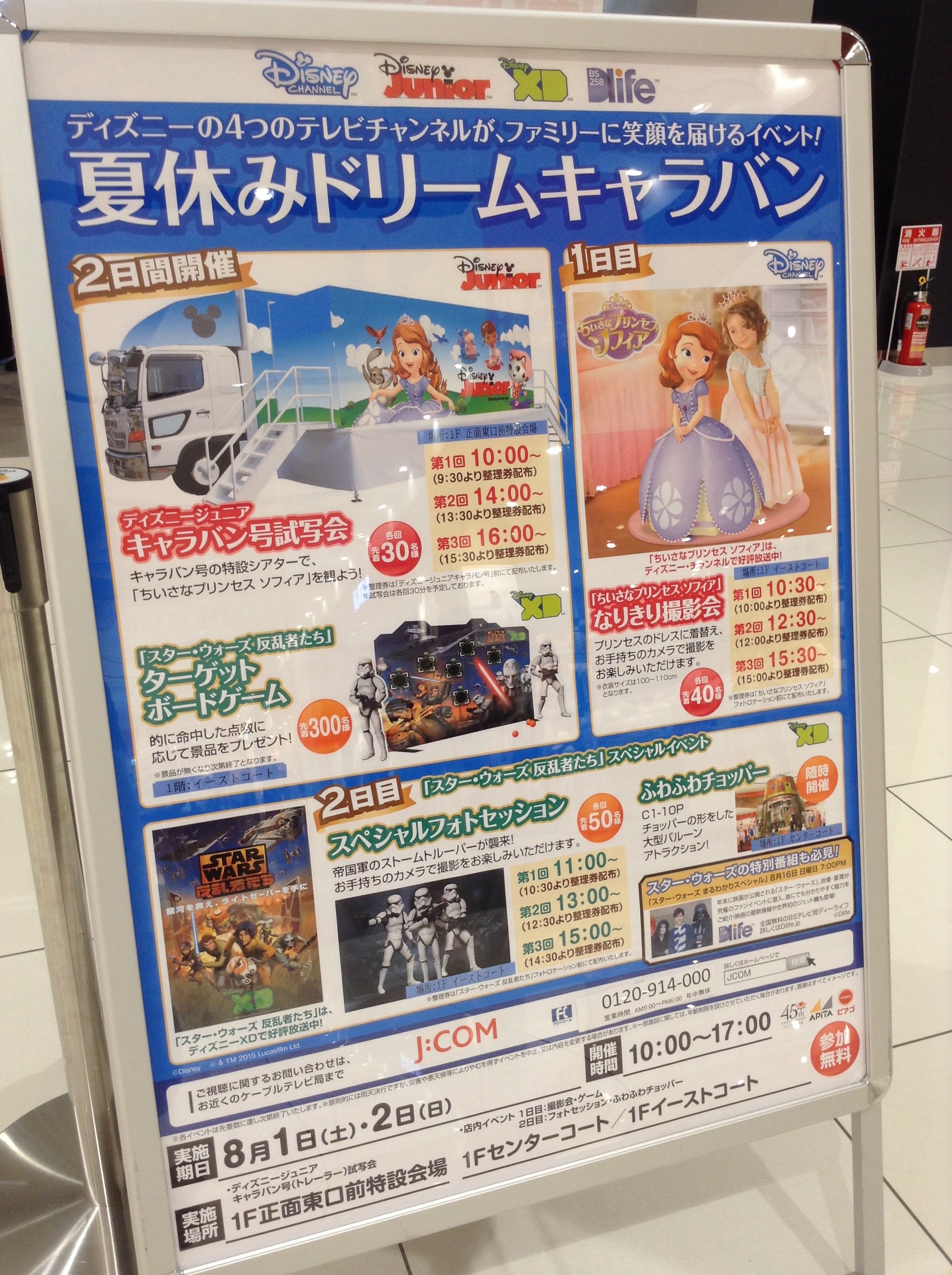 少し前のお話になってしまいましたが、8月2日(日)にベニバナウォーク桶川(アピタ桶川店)で開催された、ディズニーのテレビチャンネルイベント「夏休みドリームキャラバン」の「スター・ウォーズ 反乱者たち」スペシャルイベントに行ってきましたのでレポートします。