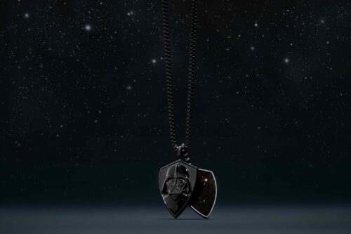 盾型のプレートに、ダース・ベイダーと銀河をデザインしたネックレス。