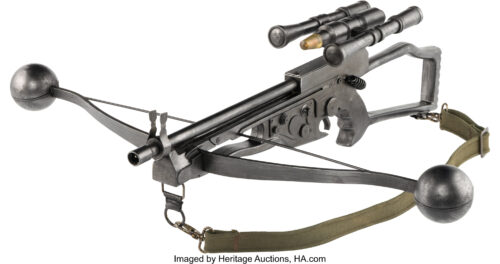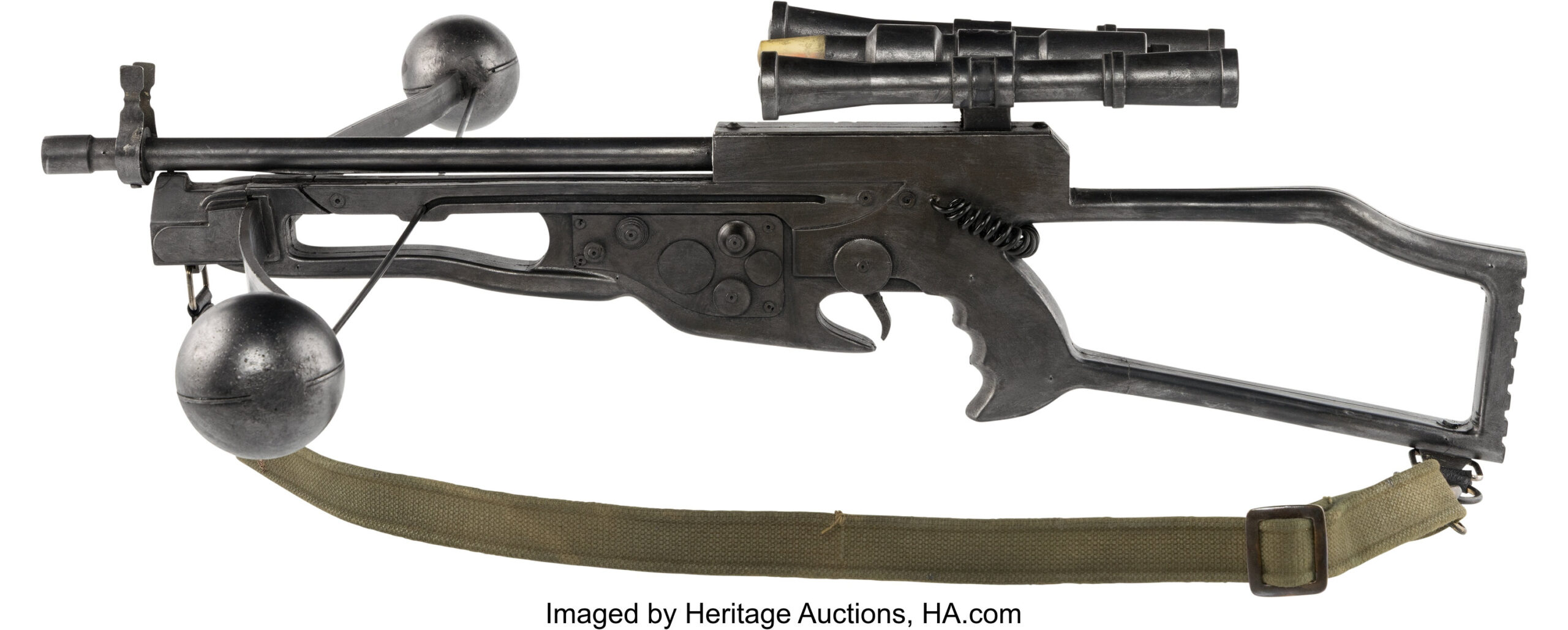 『スター・ウォーズ/フォースの覚醒』にてピーター・メイヒューとヨーナス・スオタモが使用したオリジナルのスタント用ボウキャスター。高密度ラバー製で、メタリック塗装仕上げ。弓の両端には鋳造ラバー製の球状パーツが取り付けられ、前面構造部には強度確保のため金属のパーツが組み込まれています。全体サイズは約78×81×24センチ。金属クリップで本体に固定されたグリーンのキャンバス製ストラップが付属します。