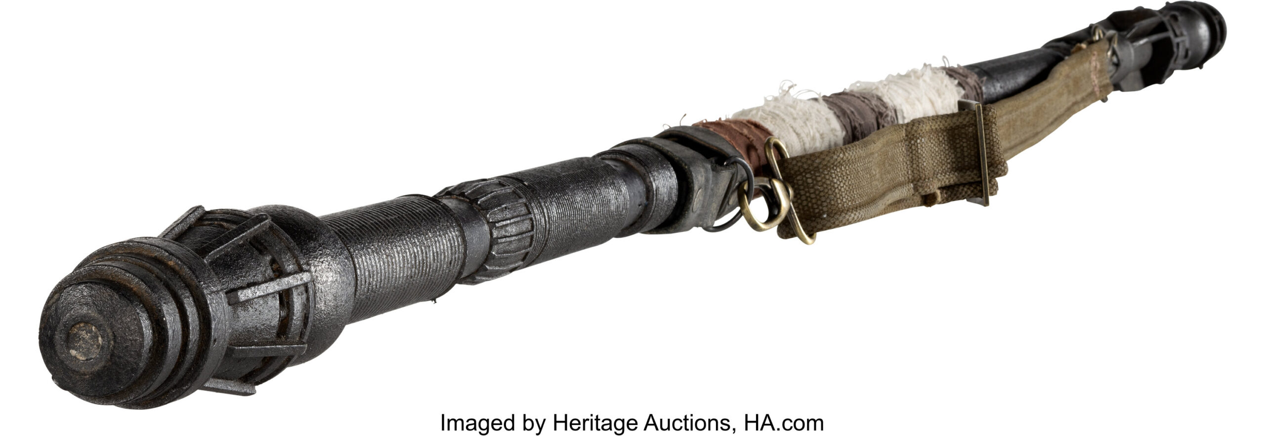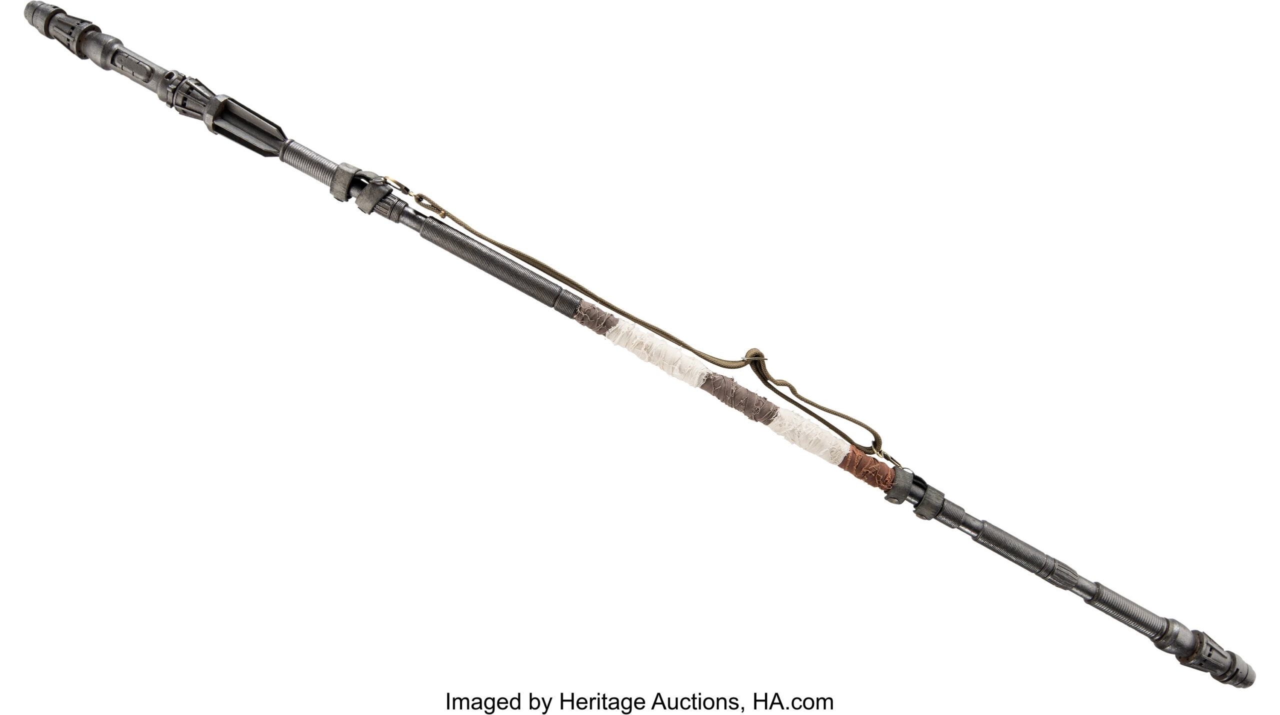 撮影の大部分で使用するために精巧に作られた軽量アクション仕様で、硬質ポリフォームおよびポリウレタン製。回収品から組み上げられた手製の武器を思わせるよう、ダークメタリック調の仕上げが施されています。サイズは約182×6センチ。多様な色と質感の布巻き装飾に加え、レザー製カフおよびロブスタークラスプで固定されたストラップを備えています。