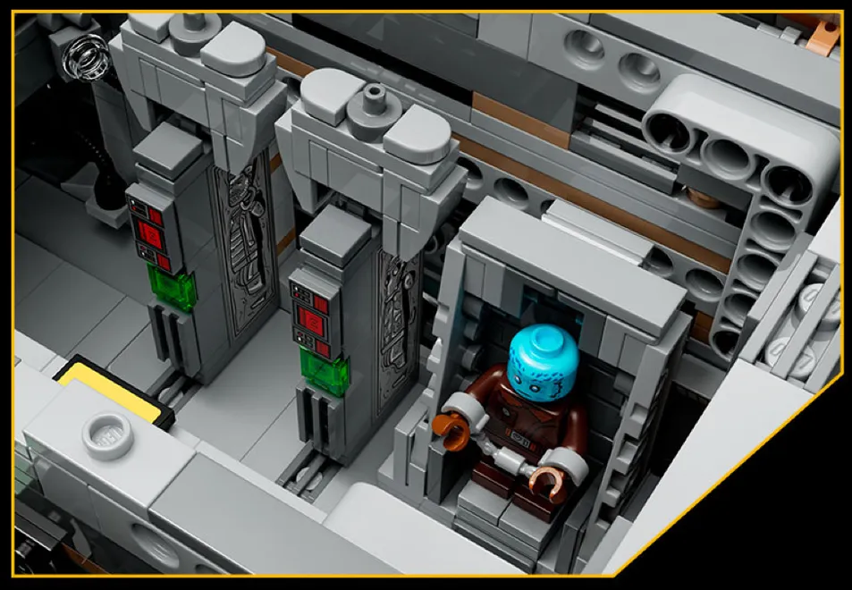 船体左右のエンジンと上部の装甲、コックピットカバーは取り外せる設計となっており、内部のチェックも可能。内部は仮眠室・サイドハッチ・貨物庫・武器棚・カーボン冷凍室・着脱式の脱出用ポッドなど、レゴサイズで緻密に再現されており、組み立てる中で劇中のシーンが次々と思い起こされるはず!