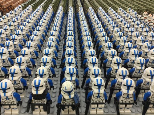 テーブルを埋め尽くしているのは、クローン・トルーパーの軍勢をはじめとした2000体以上にもおよぶレゴ『スター・ウォーズ』のミニフィグ!