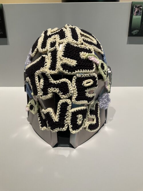 ●コンセプト:私が、ドラマシリーズ「マンダロリアン」の作品の中で特に好きなのがディン・ジャリンとグローグーの関係です。初めは付かず離れずでしたが次第にお互いの頼関係が出来上がり、互いを守り家族のように思っているその関係が愛おしく、とても癒されています。そんな2人の厳しい世界の中でも心休まるほっこりとした時間、雰囲気をベスカーでできたヘルメットと相反する素材の編み物でマンダロリアンの象徴的なフレーズ「This is the way」を表現しました。