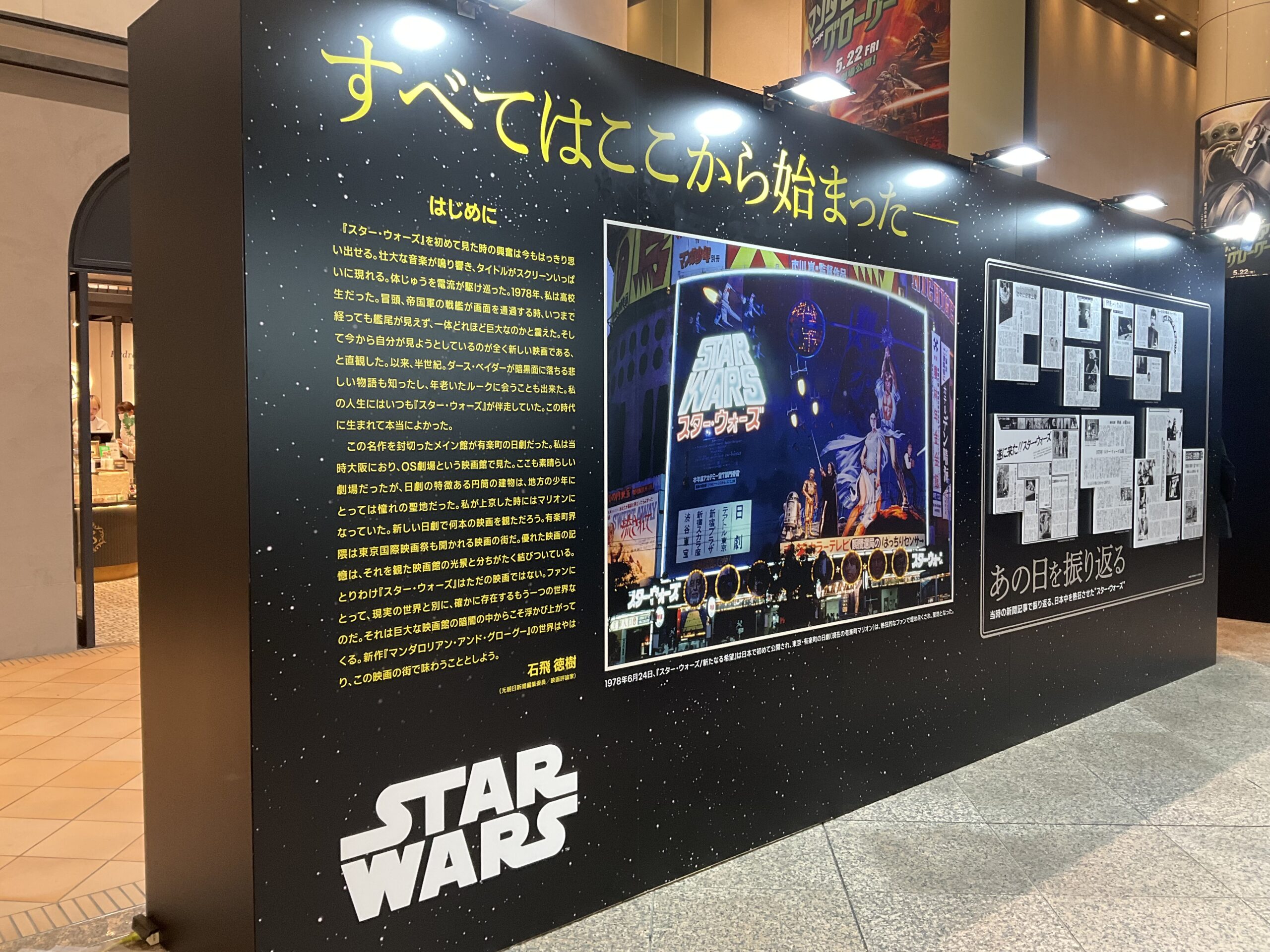 大音量でプロモーション映像を放映するスクリーンのほか、『スター・ウォーズ』の歴史を振り返るパネル展示ではマリオンにゆかりのある朝日新聞の当時の新聞記事もあり、見応えがあります!