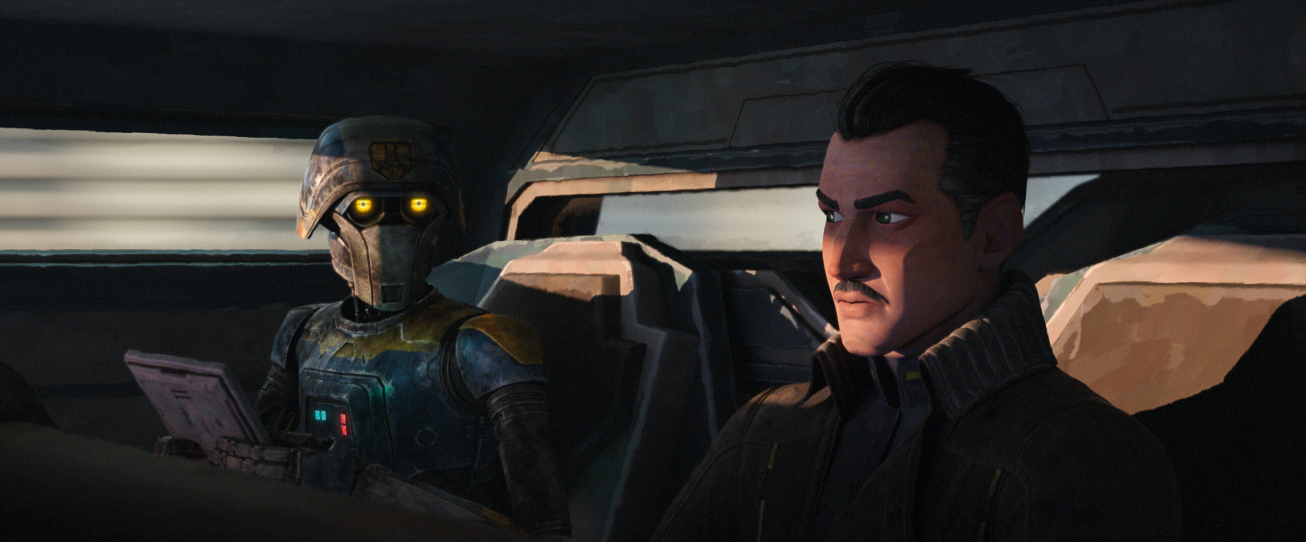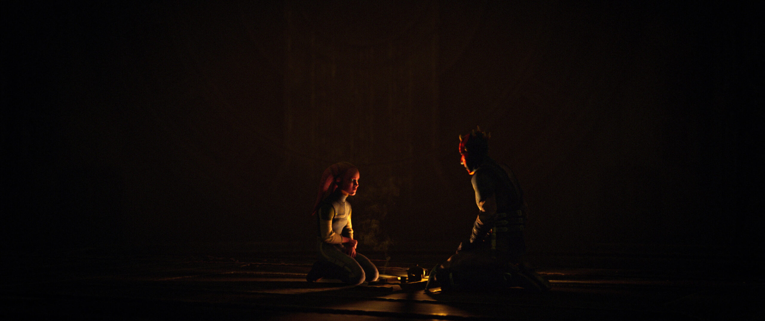デヴォン・イザラに照り返される赤い光は、ダークサイドの接近を表すとともに、真紅に染まるトワイレックということでレジェンズのダース・タロンの姿も連想させる。