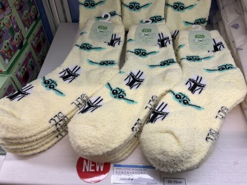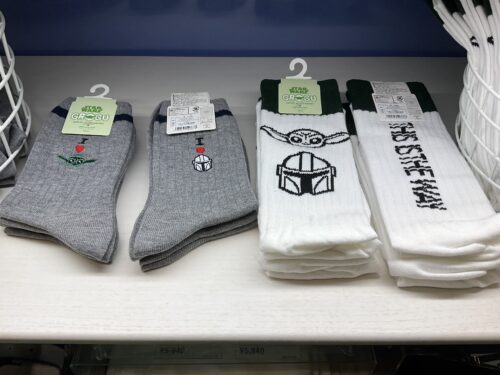 足元からディン・ジャリンとグローグーを一緒に楽しめるソックス。23~25cmの「I LOVE GROGU/MANDO」と25~27cmの「THIS IS THE WAY」の2種類があります。