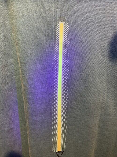 Tシャツのライトセーバー部分は蓄光プリントになっており、暗闇で光ります!写真は、ブラックライトを当てた際のTシャツ。