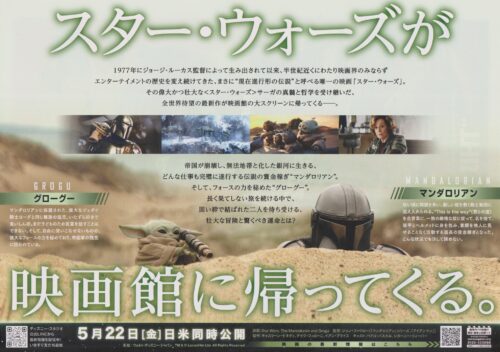 『スター・ウォーズ/マンダロリアン&グローグー』B5チラシの裏面には、「スター・ウォーズが映画館に帰ってくる。」というコピーと、ディン・ジャリンが丘に隠れつつ、グローグーがバイノキュラーを逆さに見ている…という場面写真を大きくデザイン。