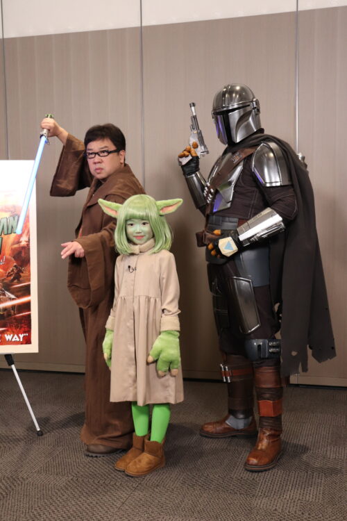 インタビューに、キャイ~ン・天野ひろゆきさんはジェダイのローブに身を包み、永尾柚乃さんはグローグーに扮した姿で登場!