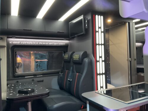まずデザイン設計の上では、キャラクターのビジュアルは使わずに『スター・ウォーズ』の世界観を車内の空間に表現することにこだわられたそうです。キャンピングカーは生活空間でもあるので、子供っぽくならないよう、『スター・ウォーズ』ファンがその世界に没入出来るような空間を再現したいという狙いです。