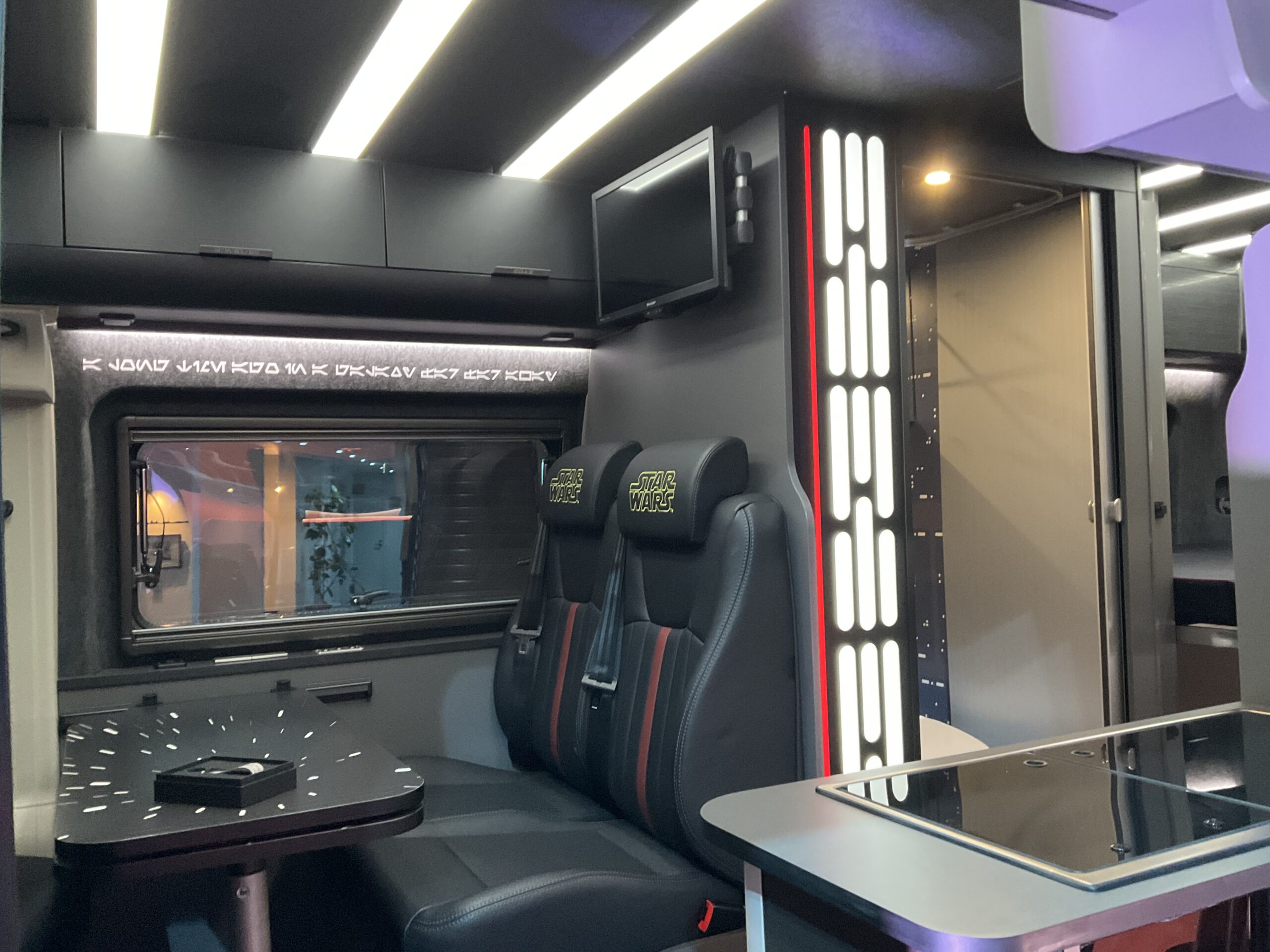 まずデザイン設計の上では、キャラクターのビジュアルは使わずに『スター・ウォーズ』の世界観を車内の空間に表現することにこだわられたそうです。キャンピングカーは生活空間でもあるので、子供っぽくならないよう、『スター・ウォーズ』ファンがその世界に没入出来るような空間を再現したいという狙いです。