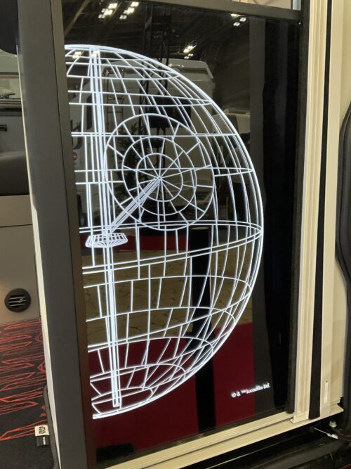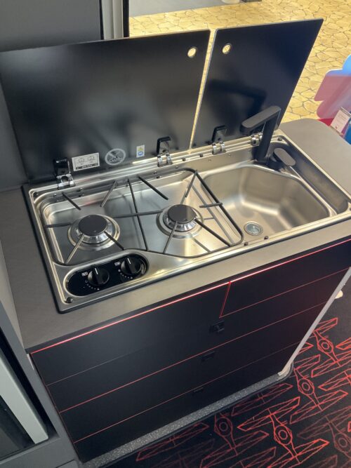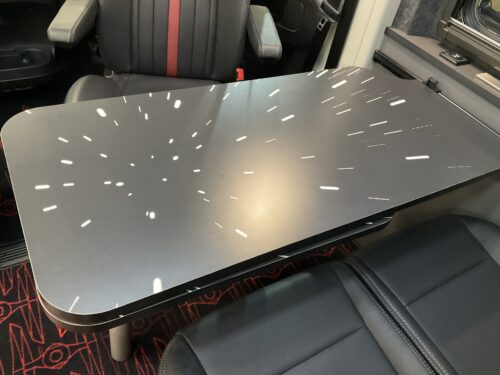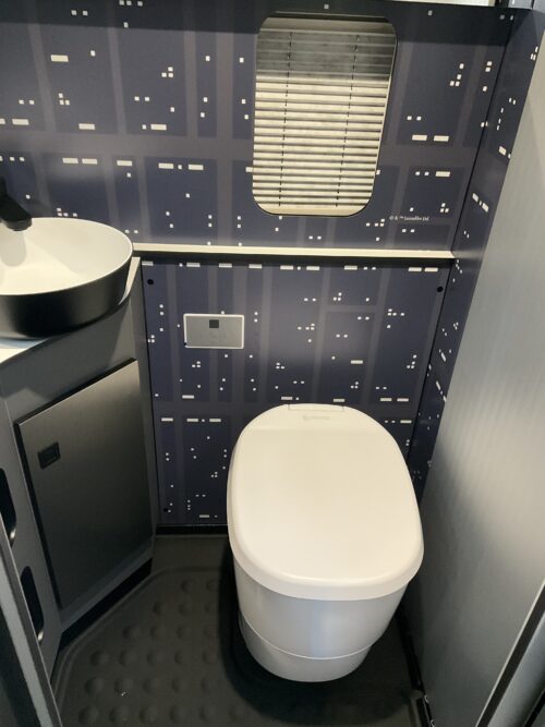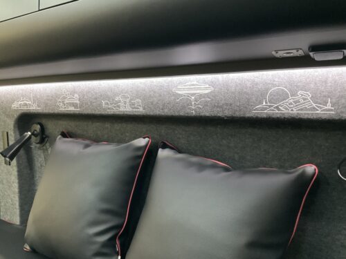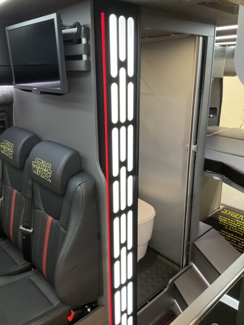 床面から天井までこの壁面照明があると、あたかも帝国軍の艦船の中にいるかのような気分になります…写真を撮りたくなるスポットがキャンピングカーの中にあるとは!赤のラインは、ダース・ベイダーのライトセーバーをイメージしています。