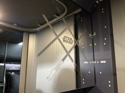 シャワー&トイレルームにあるミラーには、ダース・ベイダー、ルーク・スカイウォーカー、オビ=ワン・ケノービ、レイのライトセーバー柄をあしらったロゴ入りアートが採用されています。