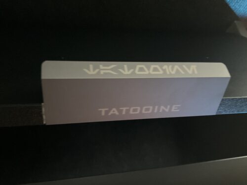 タトゥイーン、ホス、ベスピン、ジャクー、ナブーの5つの惑星の名前が記載されていますが、取っ手を開くとアルファベットでの表記が見られ、オーラベッシュの読み方がわからなくても覚えられるようになっています。