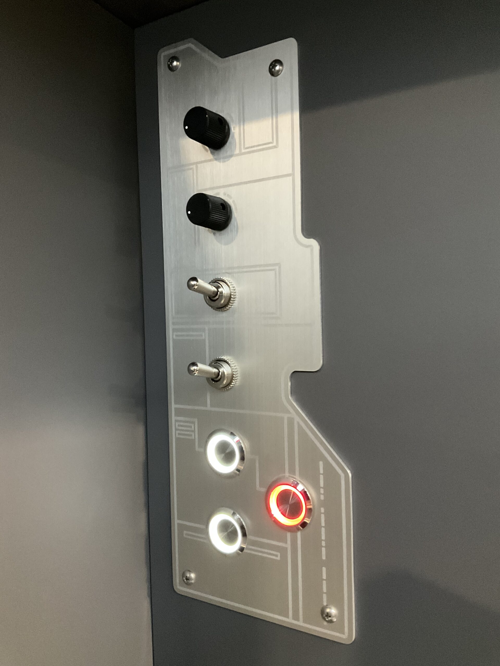 車内の照明を司るスイッチパネルは、メカニカルさを感じさせるデザイン!光る丸いボタンやつまみスイッチ、レバータイプのスイッチなど、カチッとスイッチを入れる度にワクワクさせられます!メカを操作している気分になり、ビークルに乗っているかのような没入感が楽しい…