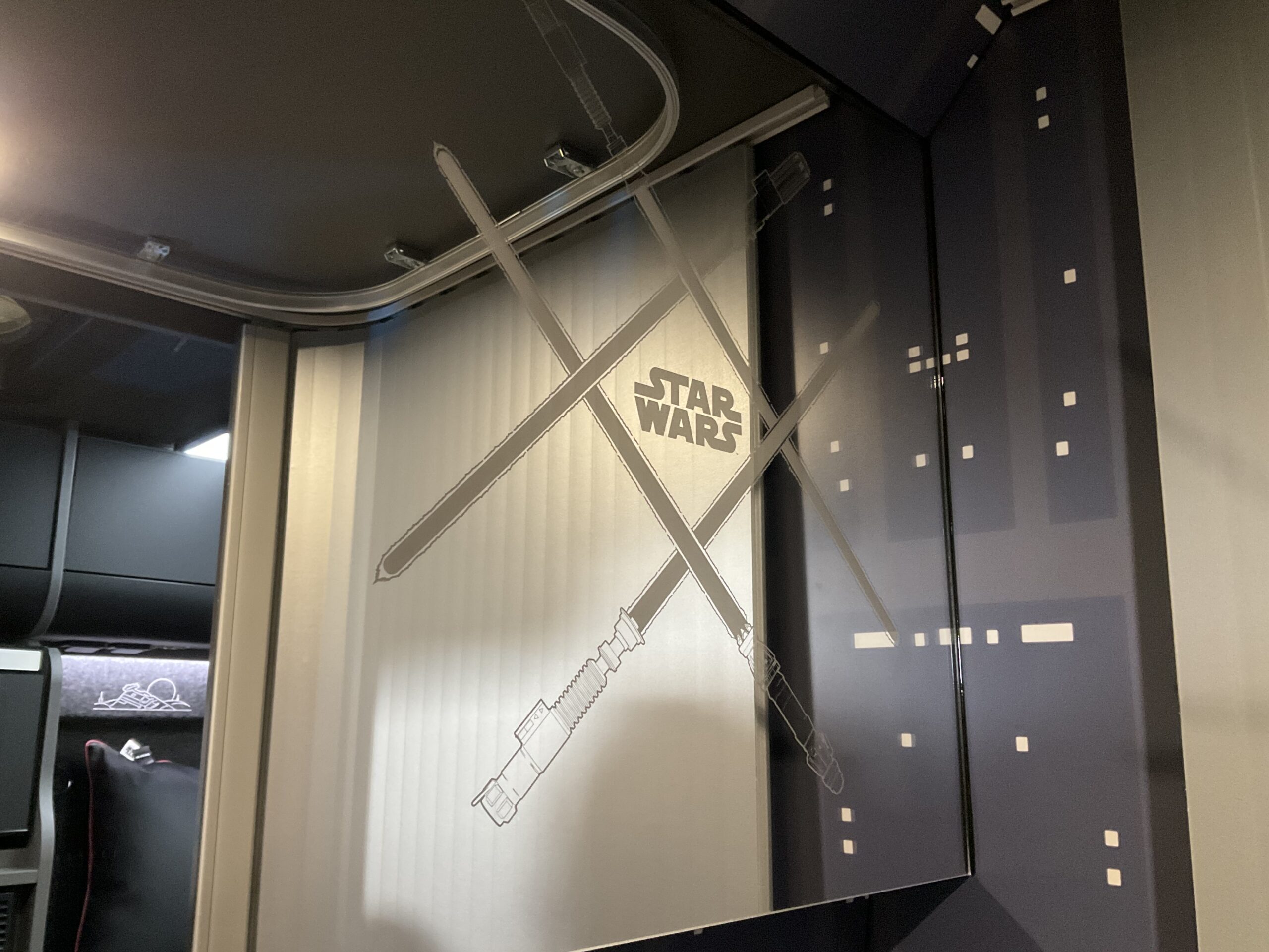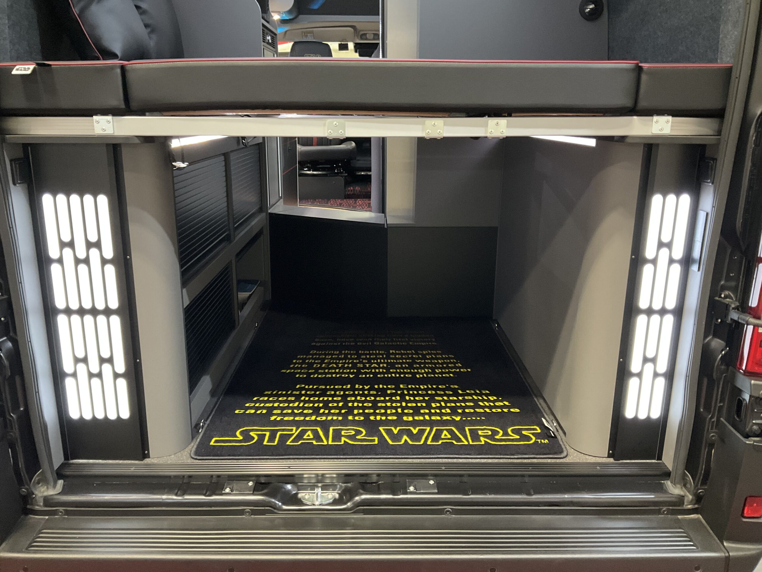帝国軍の施設を思わせるインテリアで、アウトドアだけではなく『スター・ウォーズ』の世界に自身が入り込んだかのような体験が出来そうです。この車両で旅をするだけではなく、自分の部屋のようにこの空間で日々過ごし、好きなもので満たされるという楽しみ方は、従来のキャンピングカーとはまた違った体験となるでしょう!