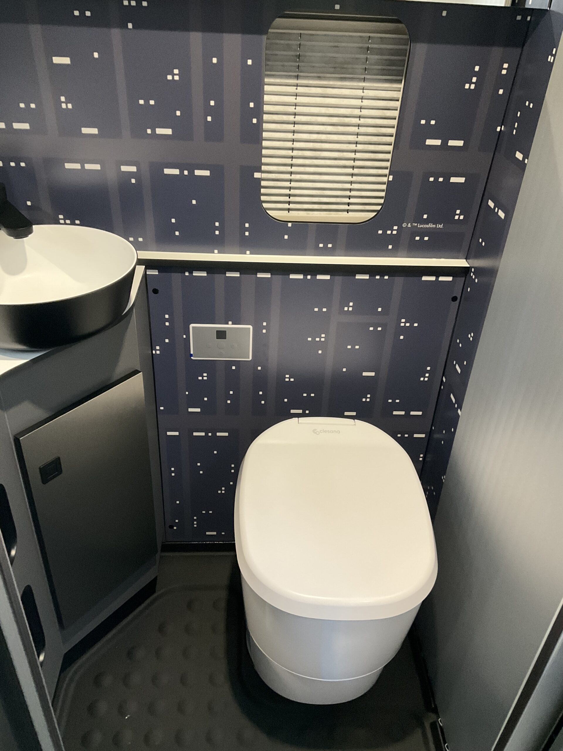 シャワー&トイレルームにあるミラーには、ダース・ベイダー、ルーク・スカイウォーカー、オビ=ワン・ケノービ、レイのライトセーバー柄をあしらったロゴ入りアートが採用されています。