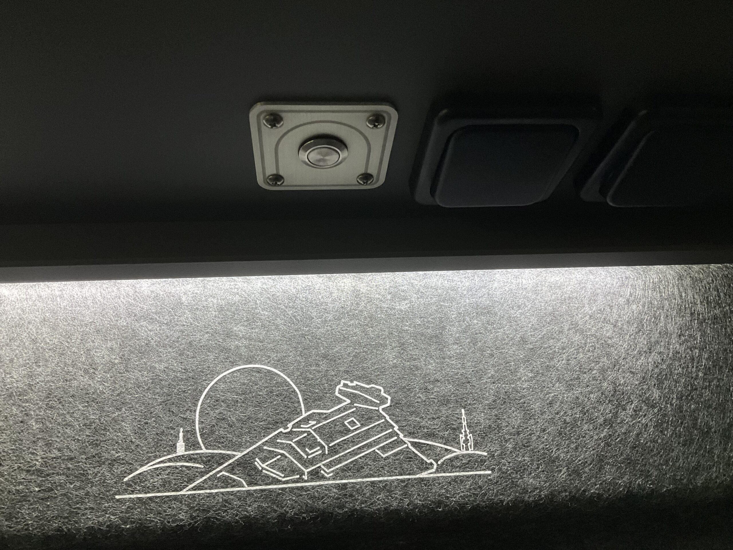 床面から天井までこの壁面照明があると、あたかも帝国軍の艦船の中にいるかのような気分になります…写真を撮りたくなるスポットがキャンピングカーの中にあるとは!赤のラインは、ダース・ベイダーのライトセーバーをイメージしています。
